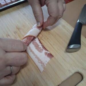- Cut the package of bacon in half, creating 28 half slices.