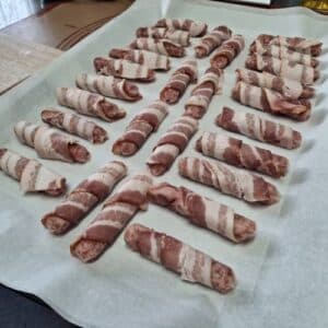 - Place wrapped sausage and bacon on the cookie sheet. Do the same for all 28 sausages.